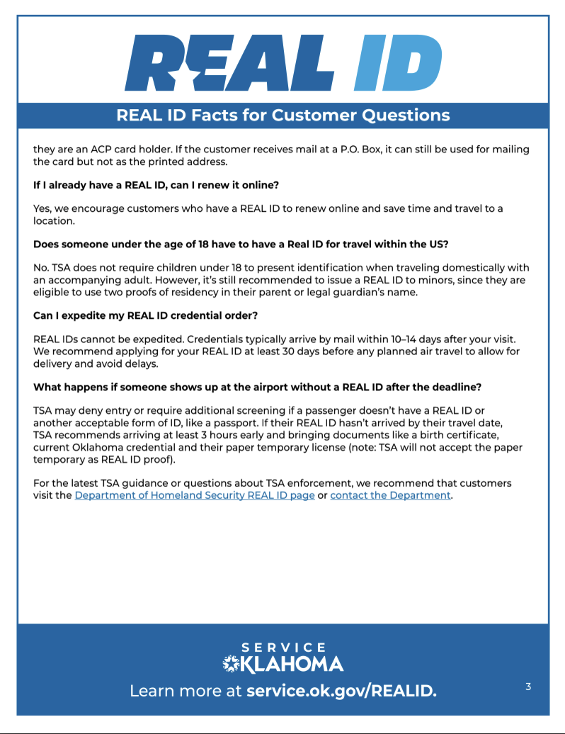 All drivers with Oklahoma Commercial Driver Licenses with HAZ MAT restrictions or endorsements (Restriction K, Endorsement H, Endorsement X) OR drivers with an out-of-state Commercial Driver License must visit a Service Oklahoma facility for license issuance or renewal. We can process all other CDL renewals and replacements in our office. You must provide one current proof of residence in your legal name and medical records must be current and on file.
